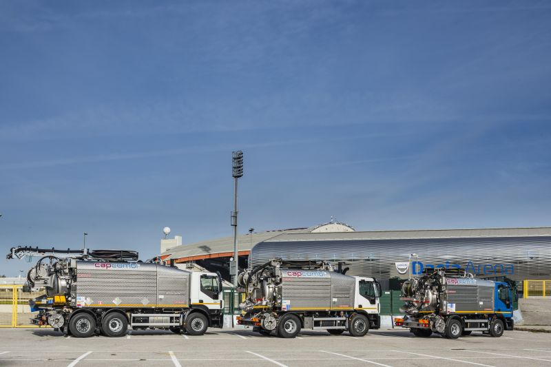 The mechanical transmission permits to drive the high pressure pump and the vacuum pump completely separate from each other or at the same time, utilizing the truck’s own PTO or the special CAPPELLOTTO’s “CAP PTO”. The patented upper suction hose reel is equipped with a telescopic, adjustable in height and 300° swivelling boom designed on the same axle.